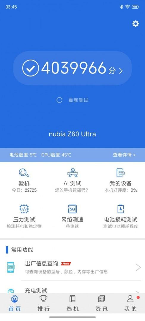 通过安兔兔的跑分测试,努比亚Z80 Ultra的得分轻松突破了403万分,这一成绩足以证明其强大的性能。无论是处理复杂的多任务操作还是运行大型游戏,都能轻松应对,毫无压力。在实际使用中,无论是打开各种应用还是进行多任务切换,都能感受到手机的快速响应和流畅操作,丝毫没有卡顿的迹象,这种强大的性能表现无疑为用户带来了极为出色的使用体验。