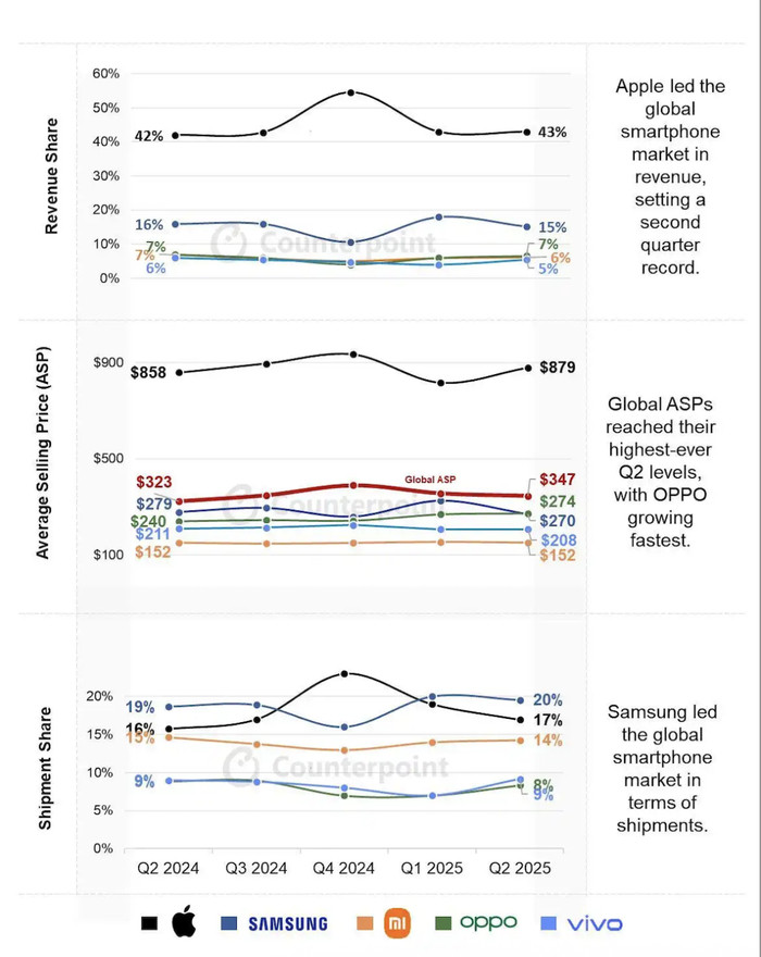 数据显示,高端市场贡献了全球智能手机营收的60%以上,其营收价值远高于其他细分赛道。而据Counterpoint数据,2025年上半年,全球高端智能手机(>$600)的市场销量同比增长8%,创历年上半年最高纪录。Counterpoint也预计,中国品牌会在600美金以上市场持续获得更大的份额。