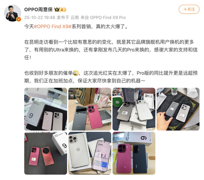 时隔一周后的首销开启,当天的预约量、销量更是异常火爆,较上代全面增长。全国多地门店现场排起长龙,不少用户提前三天预约,只为第一时间入手这款旗舰新机。OPPOFind系列产品负责人周意保微博发布其在云南“站柜”的动态,直言“追光红实在太爆了”“Pro版的同比提升更是远超预期”。